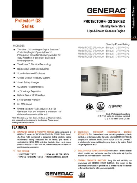 Generac Protector Qs Manual. Installation flexibility and cost reduction. Industrial power manuals and spec sheets find service.